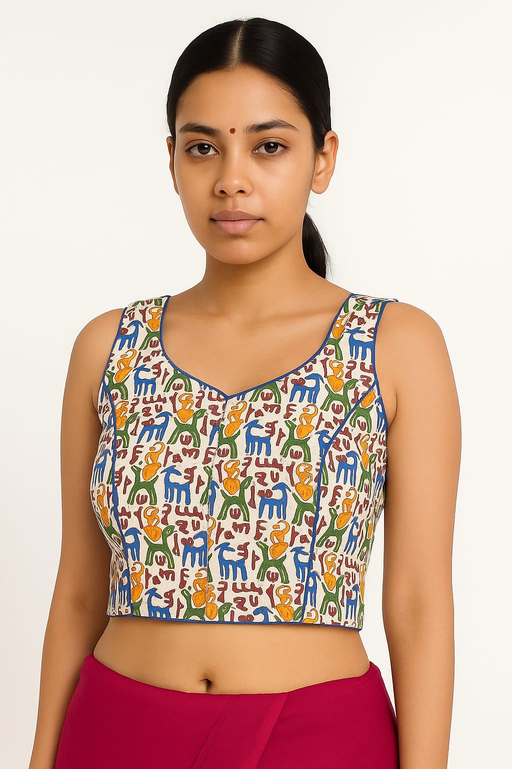 Celebrating the vibrancy of folk art and rooted in cultural expression, this printed blouse brings a refreshing twist to ethnic styling. Crafted from breathable cotton, it showcases an eclectic array of tribal-inspired motifs in bold hues of blue, green, yellow, and red—symbolizing playful charm and artistic vibrance.